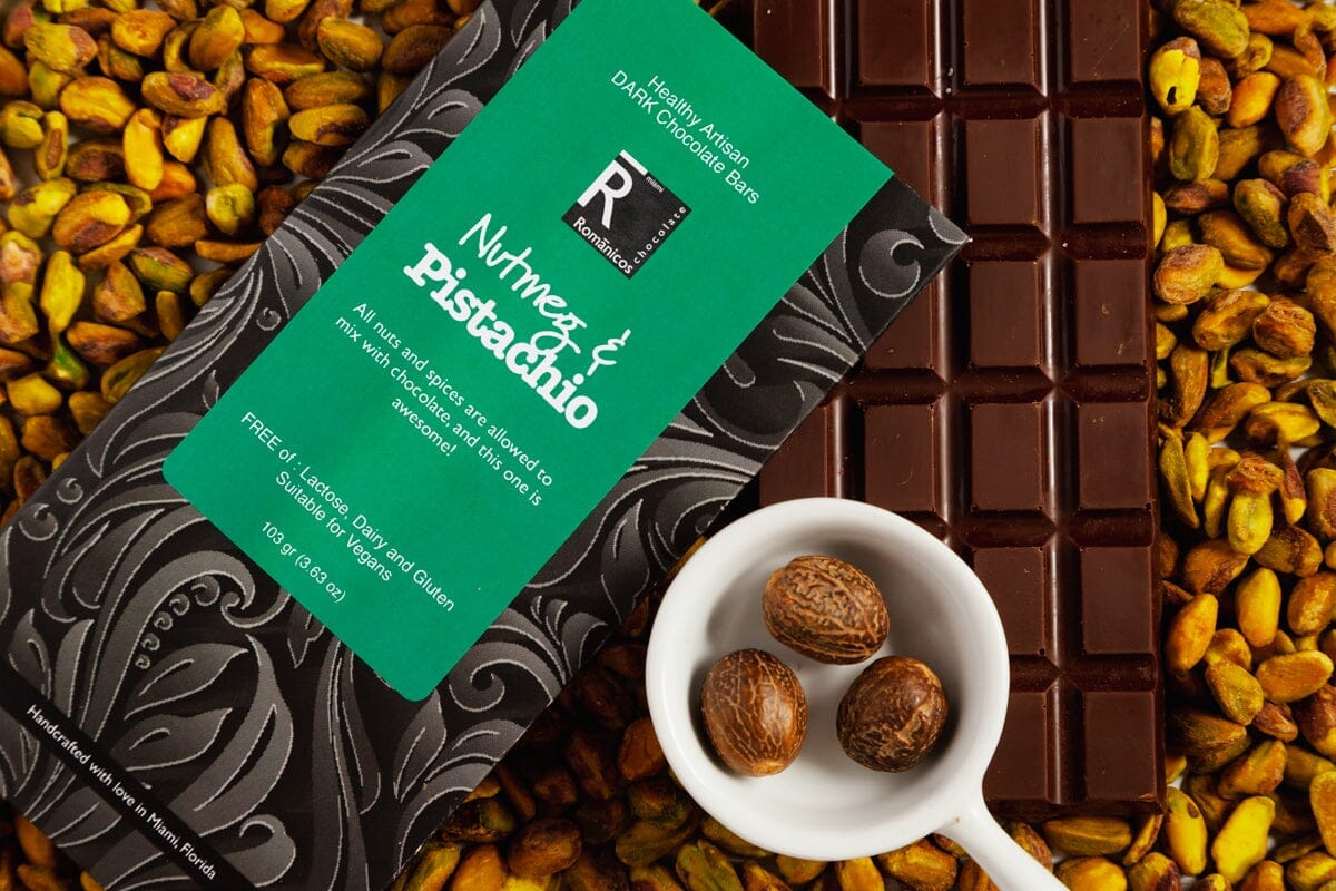 Salted Pistachio and Nutmeg Dark Chocolate Bar